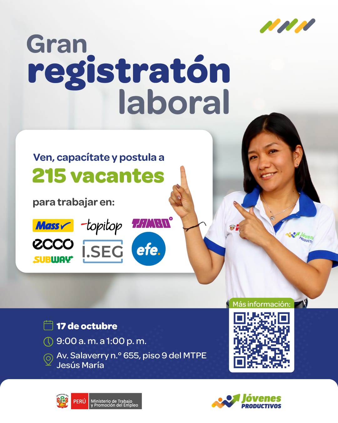 🙋🙋Estimado, te invitamos al proceso de Registratón Laboral con las empresas aliadas TIENDAS MASS, ECCO CENTER, TOPITOP, SUBWAY, TAMBO, ISEG Y TIENDAS EFE para los puestos de Operador de tienda, Asesor de ventas, Ayudante de Almacén, Vendedor de tienda, Auxiliar de Almacén, Ayudante Multifuncional y Agentes de seguridad. 🎯REQUISITOS: * Ser mayor de edad (mínimo 18 años). * Secundaria completa. * No se necesita experiencia. 🎯BENEFICIOS: * Salario desde 1130. * Ingreso a planilla con todos los beneficios de Ley. * Seguro de Essalud. * Posibilidad de hacer línea de carrera. * Puesto de trabajo Lima Metropolitana 🎯HORARIOS: ✨TIEMPO COMPLETO ✨PART TIME ✅ Día: 17 de octubre del 2025 ✅ Lugar: Av. Salaverry 655 Jesús María ✅ Hora: 9:00 a.m. No olvidar DNI y CV. 🎯Los interesados proceder a inscribirse en el siguiente Link: