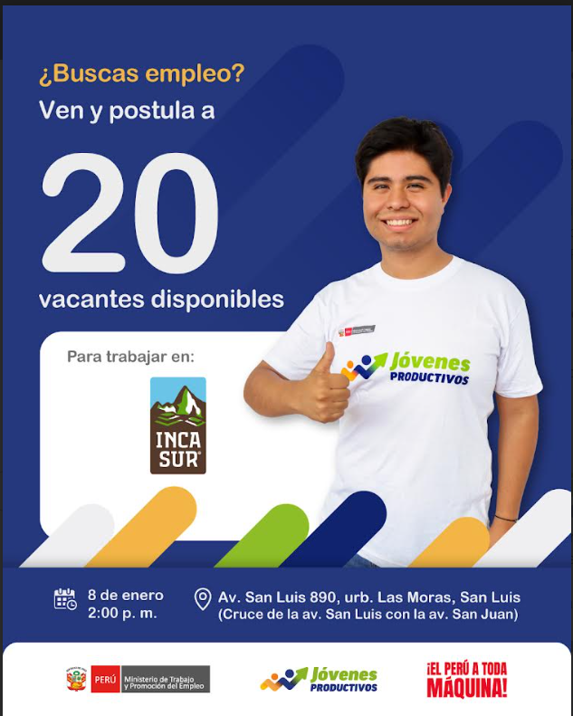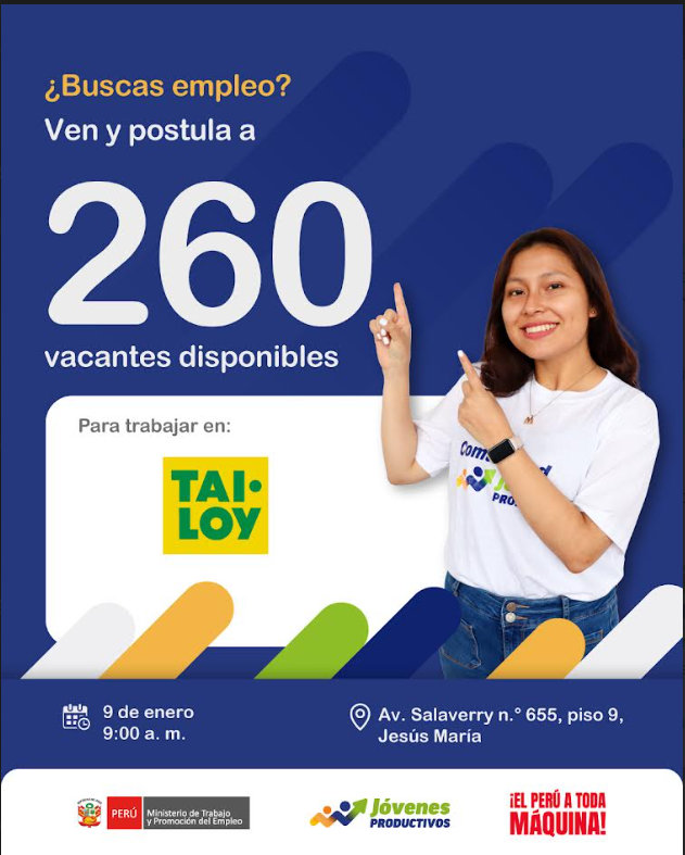 Previo saludo cordial, en el marco de las acciones del Área de Acompañamiento para la Empleabilidad, ha programado para el día 09.01.2026 realizar el Proceso de Selección con la empresa TAI LOY S.A., en el piso 9 del Programa Nac. de Empleo Jóvenes Productivos, desde las 9:00 am. Los perfiles son los siguientes: Auxiliar de tienda Cajero Vendedor de Mostrador